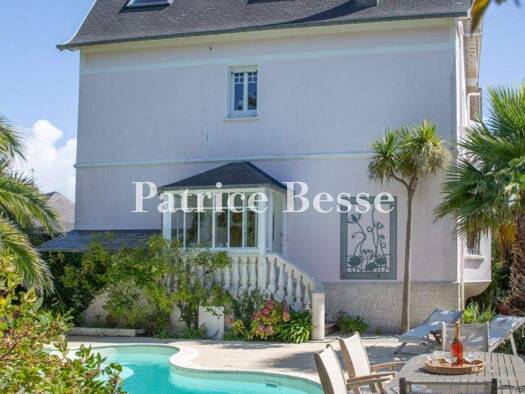 A villa from the 1930s with a swimming pool and an outbuilding, surrounded by an enclosed, tree-filled garden, in a family-oriented seaside resort on the Cotentin peninsula's western coast. In Norman...