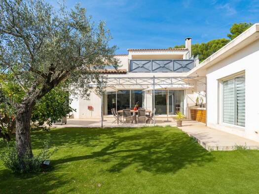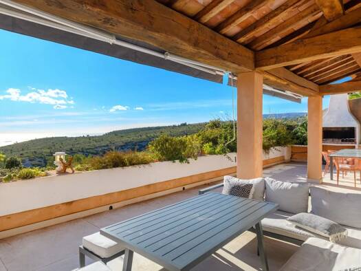 An exceptional 470 m2 architect-designed villa overlooking the bay of Cassis. Spread over two levels, it features a lush patio, a spacious sea-view reception with fireplace, a fully equipped independ...