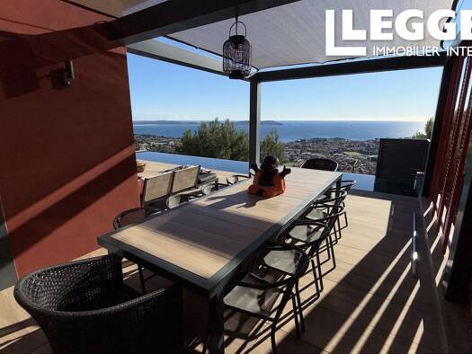 this villa of approximately 200 sqm offers an exceptional panorama of the mediterranean, the giens tombolo, and the route du sel. everywhere you look, the sea frames the views, creating a unique spec...