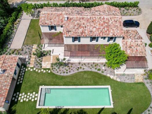 Idéalement située entre Aix-en-Provence et les Alpilles, cette contemporaine de 200 m² (2012) s'ouvre plein sud sur une piscine d'exception de 19 x 10 m et un jardin méditerranéen parfaitement paysag...