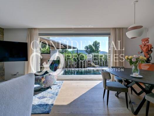Nestled in an intimate and secure residence, in absolute tranquillity, discover this charming 200 m2 house, built on a lovely enclosed and wooded 1,000 m2 plot, offering breathtaking views of the sur...