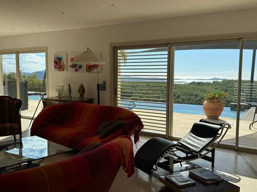 A residence with a modern allure, with an infinity pool, in grounds of one hectare, in the wooded parts of Sanary-sur-Mer, with views of the Mediterranean Sea. This property is perched in the hills i...