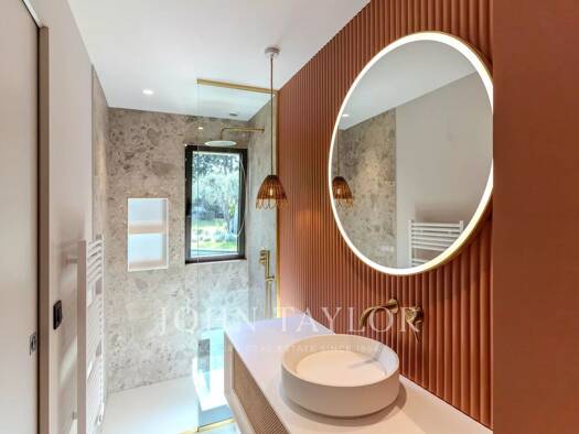 Das Anwesen befindet sich im Herzen von Mougins. Es wurde in 2015 neu gebaut. Die Wohnfläche von 270 qm ist auf 2 Etagen verteilt. Im Parterre befinden sich der große Salon mit Kamin und Zugang zur g...