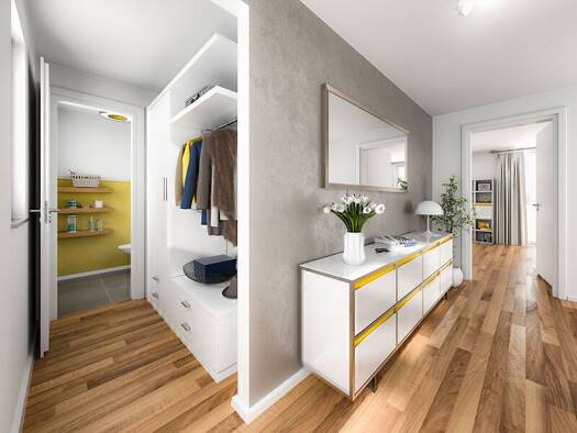 Das Raumwunder 90 überzeugt mit einer modernen und durchdachten Raumaufteilung, die großzügige Wohnflächen und viel Tageslicht bietet. Im Erdgeschoss bildet der offene Wohn- und Essbereich das Herzst...