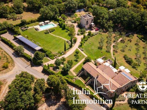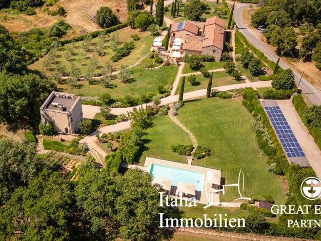Ein wunderschönes Anwesen mitten in der Maremma, in Cinigiano, bestehend aus 3 Gebäuden mit insgesamt 13 Zimmern, 16 Bädern, sowie einem ca. 1,1 ha großen Garten mit beheiztem Pool und Whirlpool. Die...