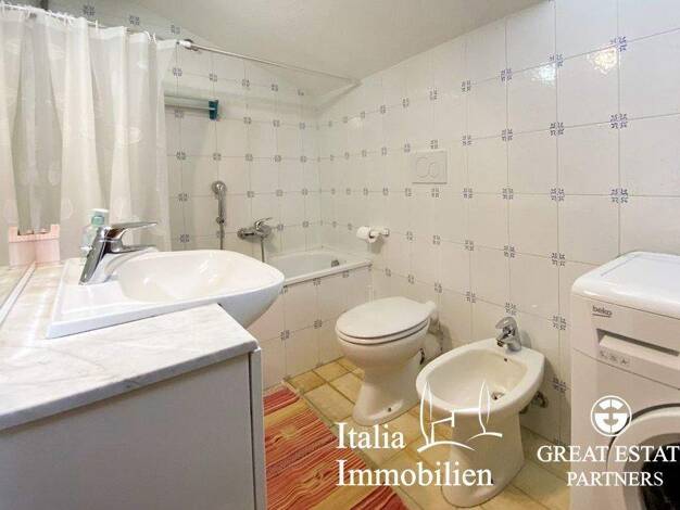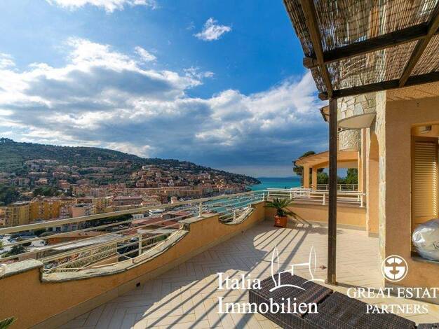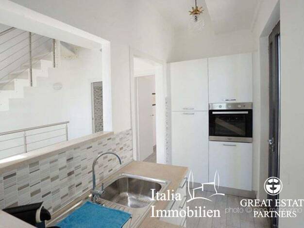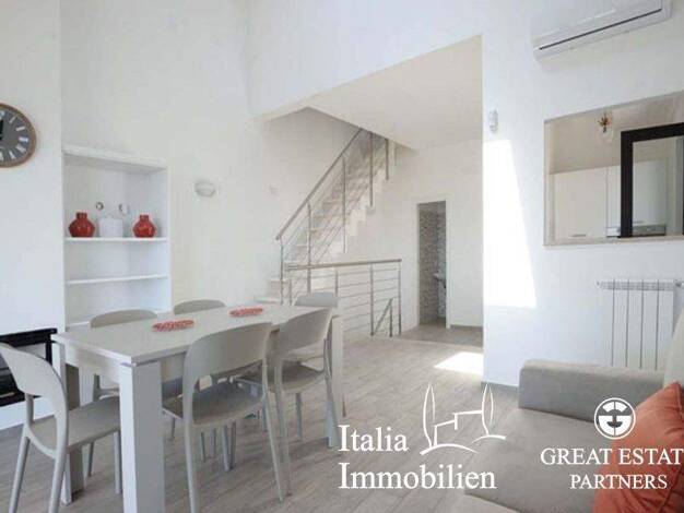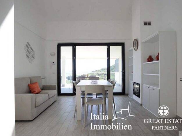 Dieses Appartament ist geschmackvoll eingerichtet und erstreckt sich über 2 Etagen: es gibt einen Eingangsbereich, schönen hellen und großen Wohnbereich mit Blick auf das Meer, ein Esszimmer mit Zuga...