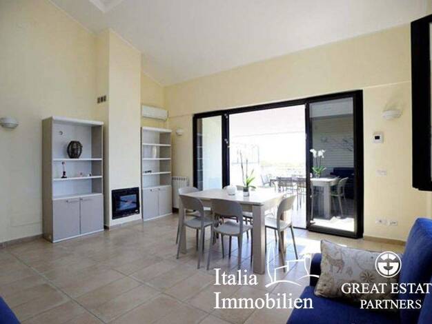 In der beliebten Wohnanlage "Il Carrubo", einem Komplex mit Grünflächen, Swimmingpool und Tennisplätzen, befindet sich dieses Penthouse in ausgezeichnetem Zustand. Es ist ca. 80 m² groß und verfügt ü...