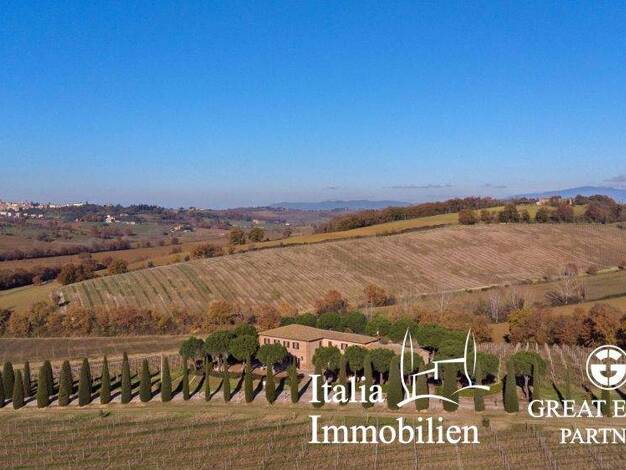 Landhaus, umgeben von wunderschönen Weinbergen mit Vino Nobile di Montepulciano und Olivenhainen mit einer Gesamtfläche von 4,7 Hektar, in der Nähe des berühmten Val d'Orcia. Dieses attraktive Weingu...