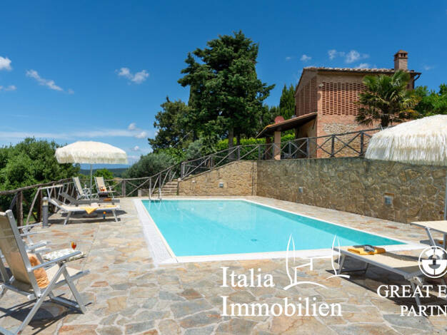 Objektbeschreibung Herrliche elegant renovierte Villa in der Nähe von Volterra in superber Panoramalage. Rund um das Gebäude gibt es 9 ha Land mit schönen Olivenbäumen und einen großen Pool. Raumauft...