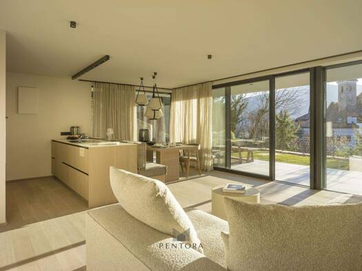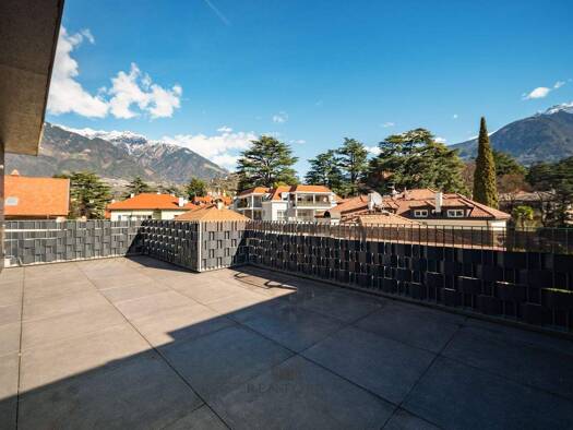 Ein Zuhause, das Großzügigkeit und Ästhetik perfekt vereint: Die weitläufige Terrasse eröffnet beeindruckende Ausblicke über die Dächer von Schenna bis zu den Bergen des Meraner Landes. Der offene Wo...