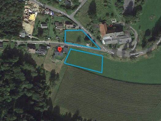 Die Gründe liegen links und vor dem ehemaligen Gasthaus/Pension SONNENHOF in Innerschlag. Bauzwang binnen 4 Jahren. Zum Teil leichte Hanglage Der Grund links vom Sonnenhof hat 1121 m² = Grundstück 1 ...