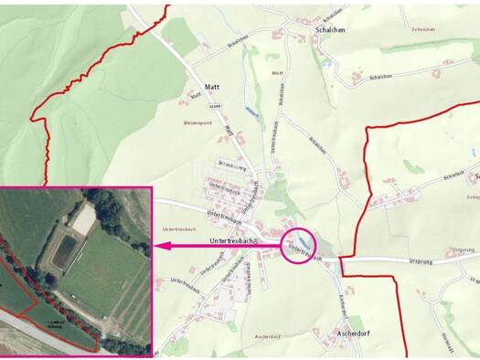 Dieses Grundstück befindet sich im Ortszentrum von Treubach und hat ein Ausmaß von rund 5.490 m². Diese Fläche teilt sich in etwa 3.300 m² Bauland (Widmung Mischbaugebiet) und ca. 2.490 m² Grün...
