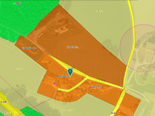 Leicht hanglagiges 1.573m² Grundstück, bestehend aus 1.259m² vermessenem, aufgeschlossenem Bauland und angrenzendem 314m² Freiland am Waldrand. Das Baugrundstück weist die Widmung "Wohngebiet allgeme...
