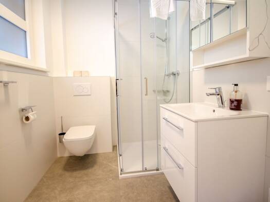 Das Haus hat eine Wohnfläche von 130 m2 inklusive der Einliegerwohnung mit 55m2. Man betritt das EFH über das Vorzimmer. Links davon gibt es ein kleines Gäste-WC mit Dusche. Links findet sich das Gäs...