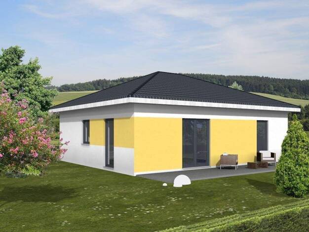 Unser Bungalow 1 Walmdach bietet auf einer Wohnfläche von 107 m² alles, was die Kleinfamilie zum Wohnen und Wohlfühlen benötigt. Das kombinierte Wohn-Ess-Zimmer ist großzügig geschnitten und dank dre...