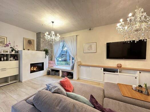 WOHNEN MIT KOMFORT UND ATMOSPHÄRE Der Mittelpunkt des Hauses ist das helle Wohnzimmer mit ca. 27,25 m², das mit einem Kachelofen ausgestattet ist. Dieser sorgt nicht nur für eine behagliche Wohnatmos...