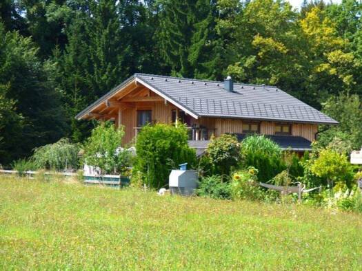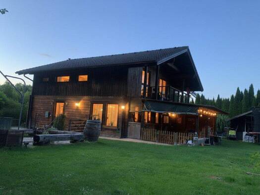 Gemütliches Holzhaus (ELK-Fertigteilhaus) BJ: 2007 in idyllischer Waldrandlage! Rund um das Haus befindet sich der Garten mit herrlich erfrischender Aussicht in den Wald und mehreren Plä...