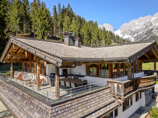 Dieses exklusive Chalet in Ellmau thront in absolut ruhiger Lage am Fuße des majestätischen Wilden Kaisers - eingebettet in eine idyllische Sackgasse unweit des Golfplatzes.
