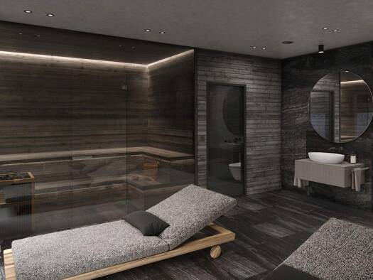 OG: Wohnzimmer, offene Küche, EG: Masterschlafzimmer mit Kamin, Schrankraum, Sauna, Wellnessbad und Außenpool UG: 2 Schlafzimmer mit Bad en suite Wirtschaftsraum