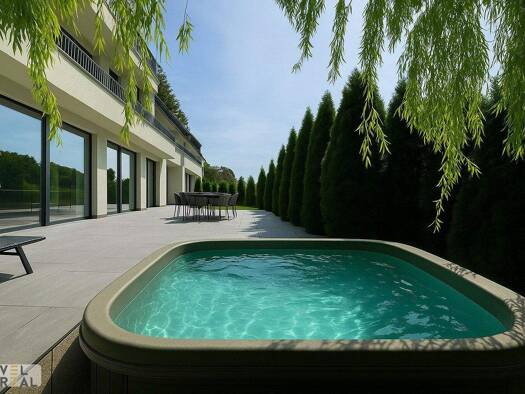High-Tech- Luxusdomizil mit Infinity-Pool in idyllischer Waldrandlage unweit vom Zentrum Klosterneuburg Adresse: Wolfsgraben, Klosterneuburg Wohnnutzfläche: 470m² inkl. Wohnkeller + Garage f 3 PKWs G...