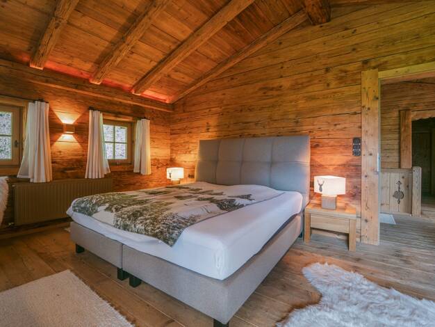 Das Chalet: Chalet K verfügt über vier Schlafzimmer im Obergeschoss mit Bad en suite und jeweils eigenem Balkon. Ein Familienappartement mit Garten im Untergeschoss und der hochwertige Wellnessbereic...