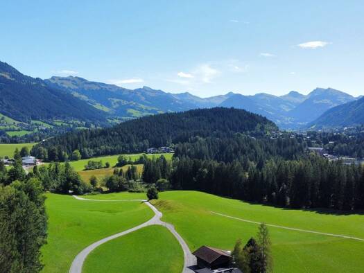 Eine bessere Lage gibt es kaum, denn sowohl Skilift, Golfplatz als auch das Stadtzentrum sind in 3 Fußminuten erreichbar. Blick auf Hahnenkamm, Kitzbüheler Horn und Wilden Kaiser, in herrlicher Ruhel...