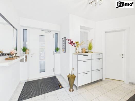 Das Haus hat eine Wohnfläche von 130 m2 inklusive der Einliegerwohnung mit 55m2. Man betritt das EFH über das Vorzimmer. Links davon gibt es ein kleines Gäste-WC mit Dusche. Links findet sich das Gäs...