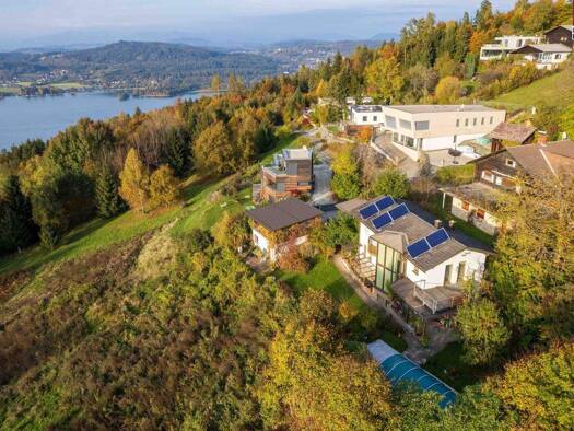 Wohnen in sonniger Panoramablicklage mit "Home-Spa" An einem der schönsten Aussichtspunkte Kärntens, hoch über Klagenfurt, liegt dieses stilvolle Ein- oder Zweifamilienhaus am Magdalensberg - ein Ort...