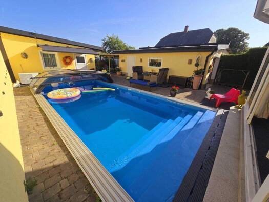 Dieses neuwertige Einfamilienhaus, befindet sich in einem großflächigen Gartenparadies, ausgestattet mit zwei Straßenzufahrten (Haupt- und Nebenstraße), Wintergarten, beheiztem und überdachtem Swimmi...