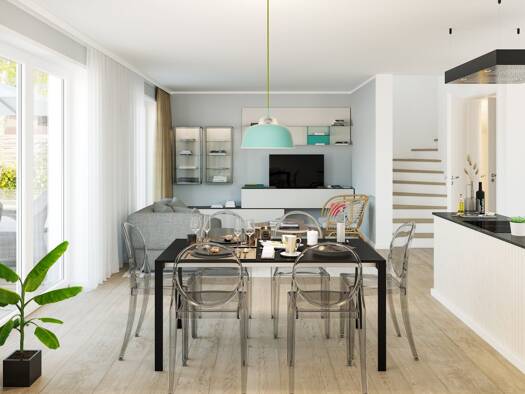 Schlicht und schick! Nicht nur das beliebte Stadtvillen-Design überzeugt Paare und Familien, auch ein cleverer Grundriss und hoher Wohnkomfort laden zum Wohlfühlen ein. Ein großzügiger Wohnraum biete...