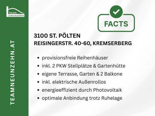 Erfüllen Sie sich den Traum vom Eigenheim in sehr guter Lage am Kremserberg in St. Pölten! Projektdetails: Hier entstehen 11 freifinanzierte Reihenhäuser im Eigentum, die modernste Wohnqualität...