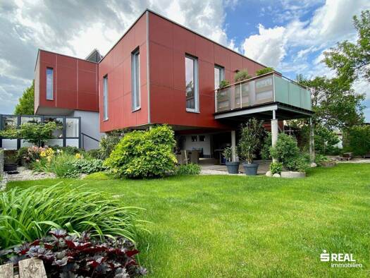 RUHE GENIESSEN, STADT SPÜREN Am Ende einer ruhigen Sackgasse, wo nur Vogelgezwitscher den Tag begrüßt, liegt dieses moderne Einfamilienhaus in Puchberg. 2019 von der renommierten Baufirma Gerstl erri...
