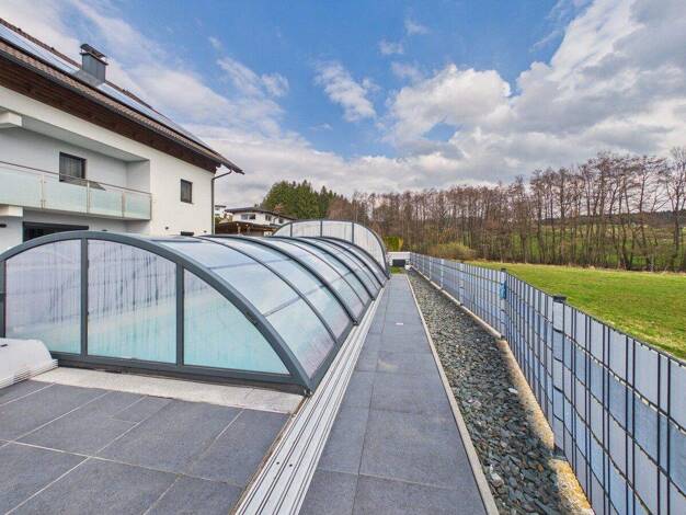 Hochwertige Luxusvilla in bestem Bauzustand Diese großzügige, lichtdurchflutete Luxusvilla befindet sich an prominenter, exponiert und erhöhter Lage über Edelstal. Die absolute Ruhelage gewährleistet...
