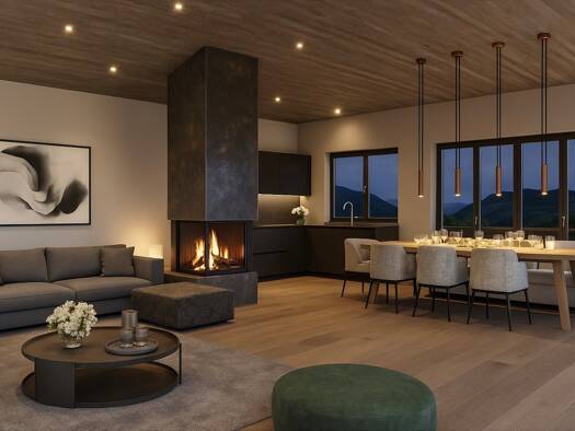 Ein Haus, das nicht spart - weder an Raum, noch an Licht. Der weitläufige Wohn- und Essbereich mit Kachelofen öffnet sich direkt zur sonnigen Terrasse mit offenem Kamin. Ein perfekter Platz für lange...
