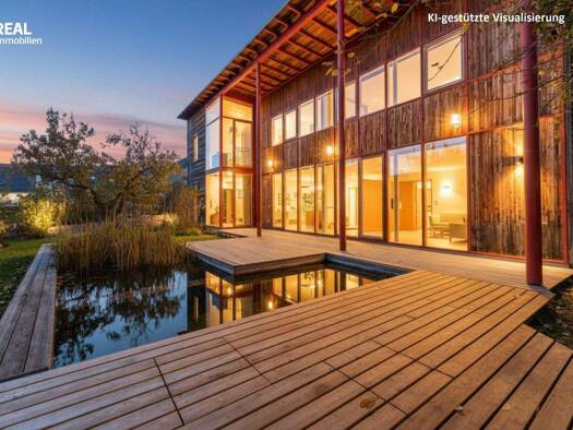 Zum Verkauf gelangt hier ein einzigartiges Architektenhaus in ökologischer Bauweise (rund 220m² Nfl.) mit wunderschönem Garten (Grundstücksgröße = 861m²) samt Naturbadeteich in zentrumsnaher Wohnlage...