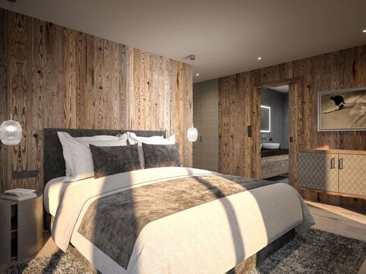 Das Chalet: Chalet K verfügt über vier Schlafzimmer im Obergeschoss mit Bad en suite und jeweils eigenem Balkon. Ein Familienappartement mit Garten im Untergeschoss und der hochwertige Wellnessbereic...