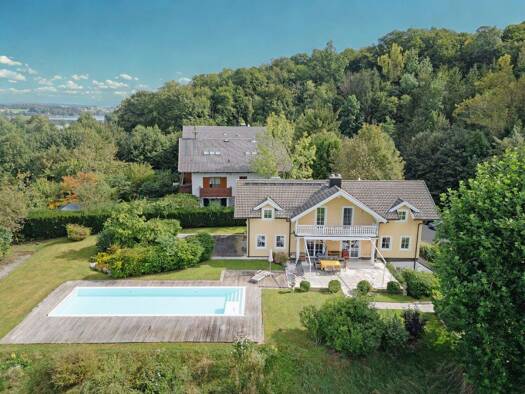 In erhöhter Lage mit traumhaftem Fernblick bis hin zu den Bergen präsentiert sich diese außergewöhnliche Liegenschaft als gelungenes Zusammenspiel aus moderner Architektur, durchdachter Raumplanung u...