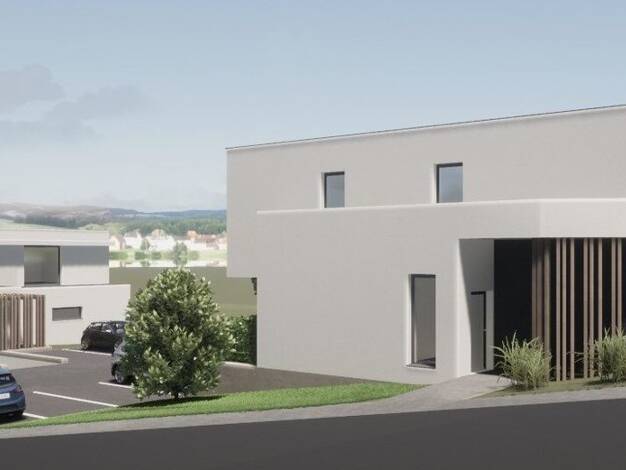 zwei freistehende, nicht unterkellerte Doppelhäuser im Rohbauzustand mit 718,36 qm WNFl. und 1.735 qm Grund - mit Terrassen im Erdgeschoss, Loggien im Obergeschoss und Flachdach - mit vier geplanten ...