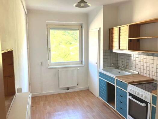 Ausstattung: Vorraum, Küche mit Essplatz und Abstellraum, 1 Wohnzimmer, 2 Schlafzimmer, Bad mit Wanne, WC, 2 Balkone, Parkett- und Fliesenböden, Fernwärmeheizung, Kellerabteil. Ein Parkplatz ist nach...