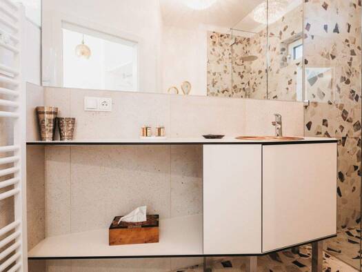 Diese wunderschön sonnige und außergewöhnliche Wohnung mit Gartenanlage war ursprünglich als Hotel geplant. Deshalb beinhaltet eigentlich 2 Wohnungen, die spiegelverkehrt designt sind, und 2 Küchen, ...