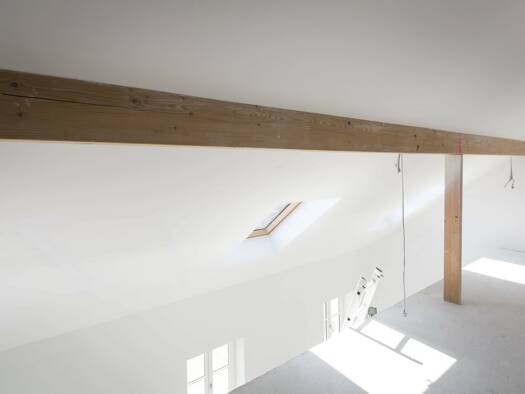 Untere Ebene = 1.Stock Über einen großen Vorraum (ca. 12 m²), in dem sich auch die gediegene Holztreppe hinauf in die Mansarde befindet, gelangt man in den Wohnsalon. Er weist einen großzügigen Loft-...
