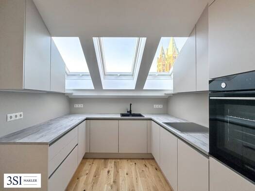 Neben dem einzigartigen, offen gestalteten Split-Level-Zuschnitt über zwei Ebenen - mit einem über eine halbhoch versetzte Galerie erschlossenen Schlafbereich - überzeugen trotz Dachgeschoßlage die l...