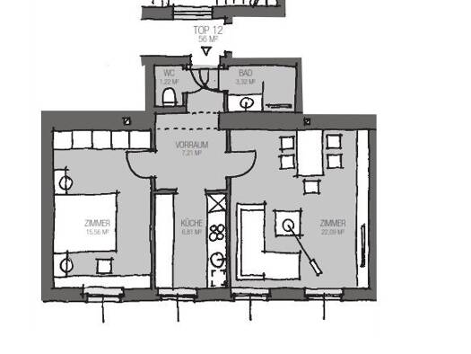 TOP 23 Zum Verkauf gelangt eine geräumige 2-Zimmer Wohnung mit hofseitiger Ausrichtung: * Vorraum * Abstellraum mit Waschmaschinenanschluss * Wohnküche * Schlafzimmer * Badezimmer mit bod...