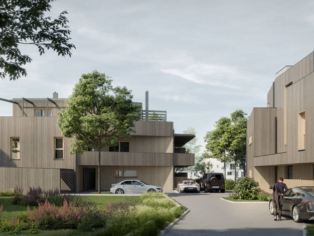Die geradlinigen Wohngebäude sind in den Hang gebaut und verschwinden scheinbar in der grünen Umgebung. Die Bewohner genießen entweder den Rückzug in ihre Ruheoase oder verbringen entspannte Stunden ...