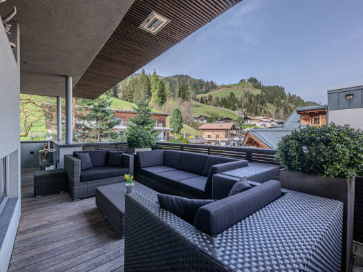 Stilvolle und exklusive Maisonette-Wohnung mit Dachterrasse und Blick auf den Wilden Kaiser & das Kitzbüheler Horn Zum Verkauf steht eine außergewöhnliche 4-Zimmer-Maisonette-Wohnung in der idyll...