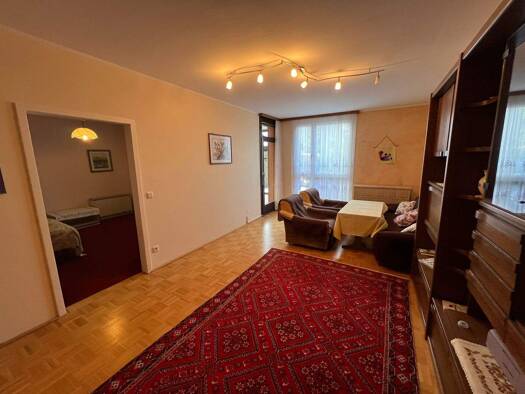 Ausstattung: Vorraum, Wohnzimmer mit Zugang zum 14 m² großen, verglasten Wintergarten, Küche, 1 Schlafzimmer, Bad mit Wanne, WC, Abstellraum, Elektronachtspeicherheizung, Kellerabteil , 1 Tiefgaragen...