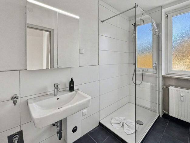 Objektbeschreibung Licht, Luft und Lebensfreude – diese stilvolle 3-Zimmer-Wohnung im Erdgeschoss ist ein Ort zum Ankommen und Zuhausefühlen. Großzügige Fenster lassen den Wohnbereich in warmem Tages...