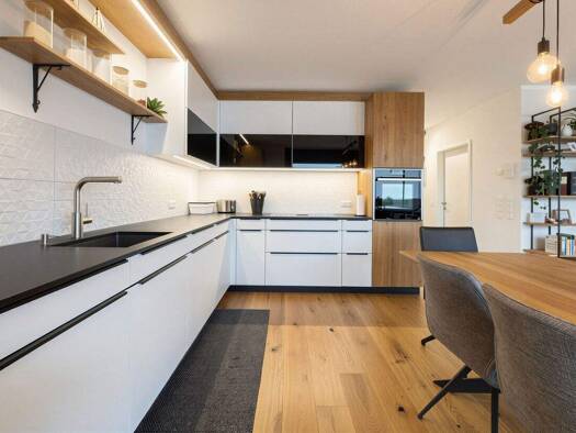 - 80 m² Wohnfläche | 20 m² Terrasse - moderne, hochwertige Ausstattung von regionalem Schreiner - Küche mit Bora-Induktionskochfeld und Backrohr mit Dampfgarfunktion - raumhohe Verglasung im Wohn-Ess...