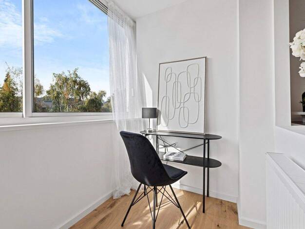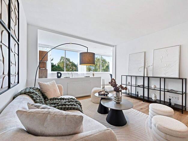 Vom geräumigen Wohnzimmer mit angrenzender Küche gelangt man auf den breiten Balkon mit freiem Blick auf prächtige Baumkronen oder hinunter in den Garten. Das Schlafzimmer mit Klimaanlage und eigenem...