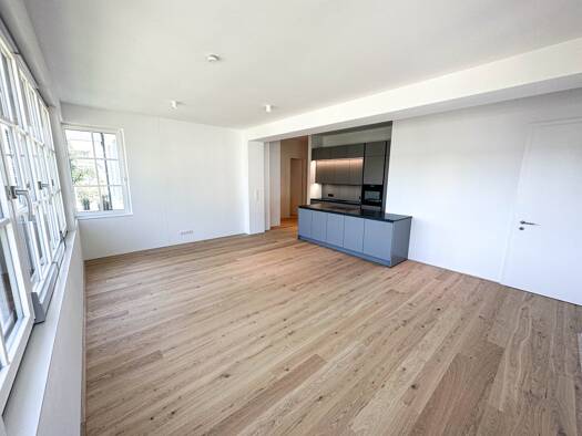 Moderne, top removierte 5-Zimmer Wohnung, verfügt über ein geräumiges Wohnzimmer mit traditionellen architektonischen Merkmalen inkl. Kachelofen und Tagesbett, eine voll ausgestattete DAN-Küche mit K...